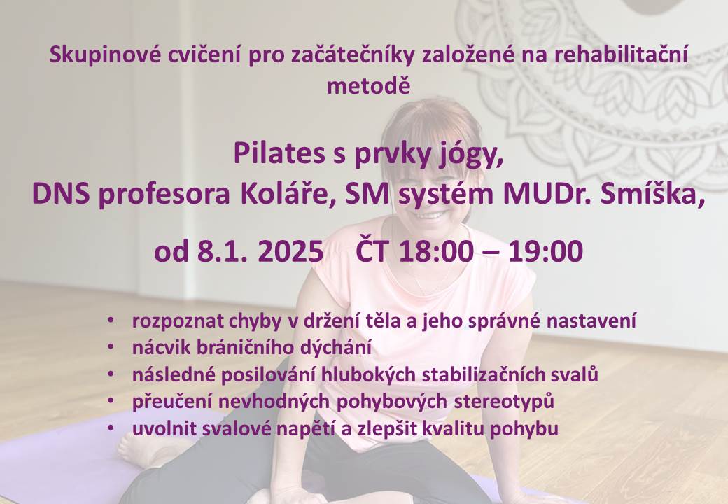 Uzavřený kurz pro začátečníky - principy zdravého pohybu - nácvik správného dýchání, polohy těla, aktivace hlubokých stabilizačních svalů, úprava pohybových vzorců (koncentrace, kontrola, plynulost, přesnost, zapojení středu těla, dýchání)